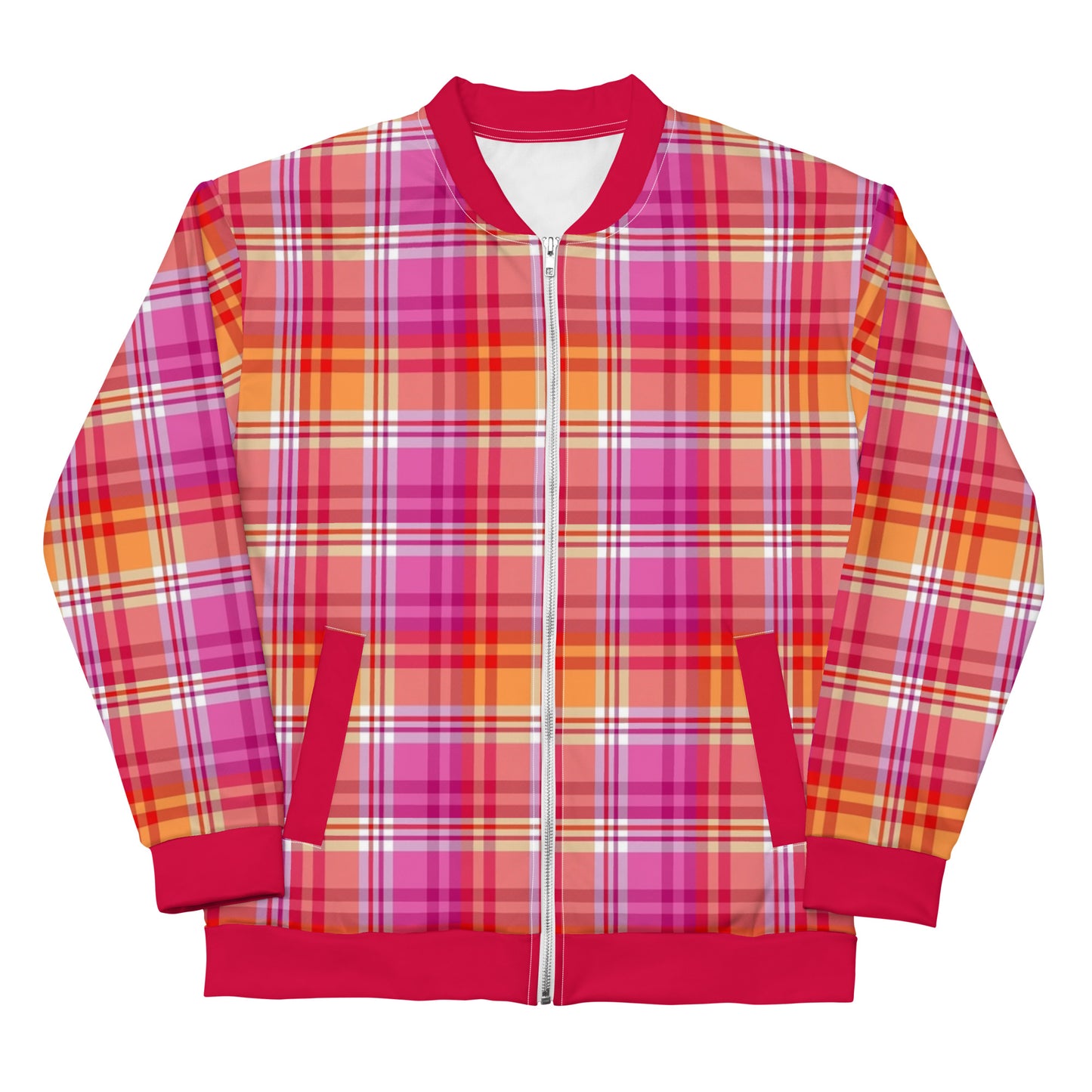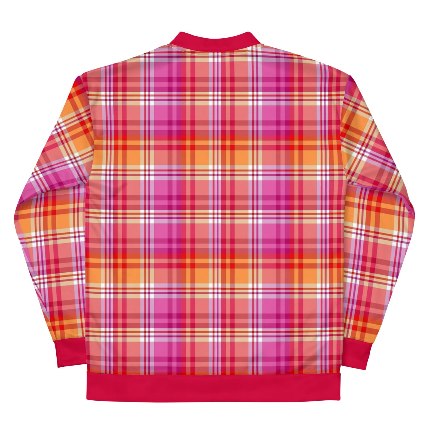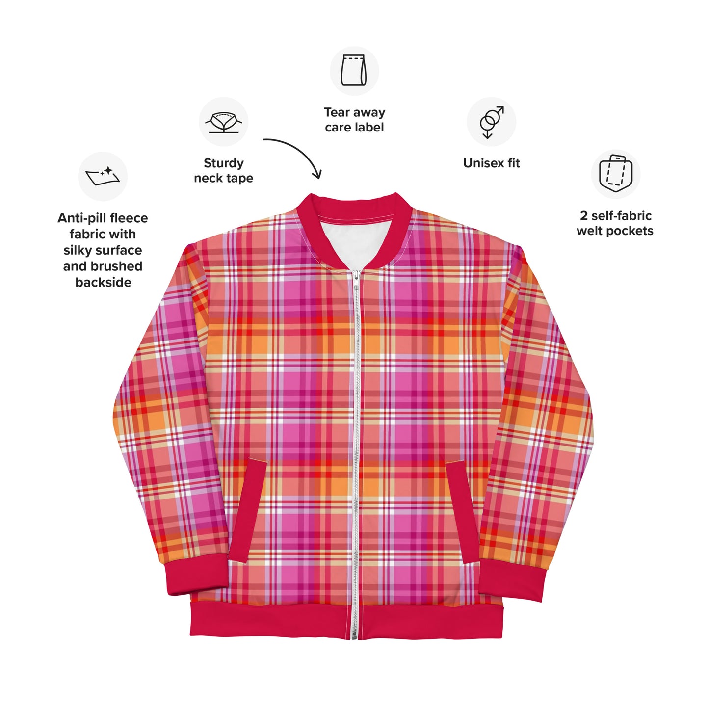 Add a little lesbian pride to your wardrobe with this vibrant Plaid Bomber Jacket. Wear it with a basic t-shirt, or layer it on top of one of our warm hoodies—it’ll look great either way. With a brushed fleece inside, and a relaxed unisex fit, this Bomber Coat is just the stuff of dreams, so be quick to grab yourself one!