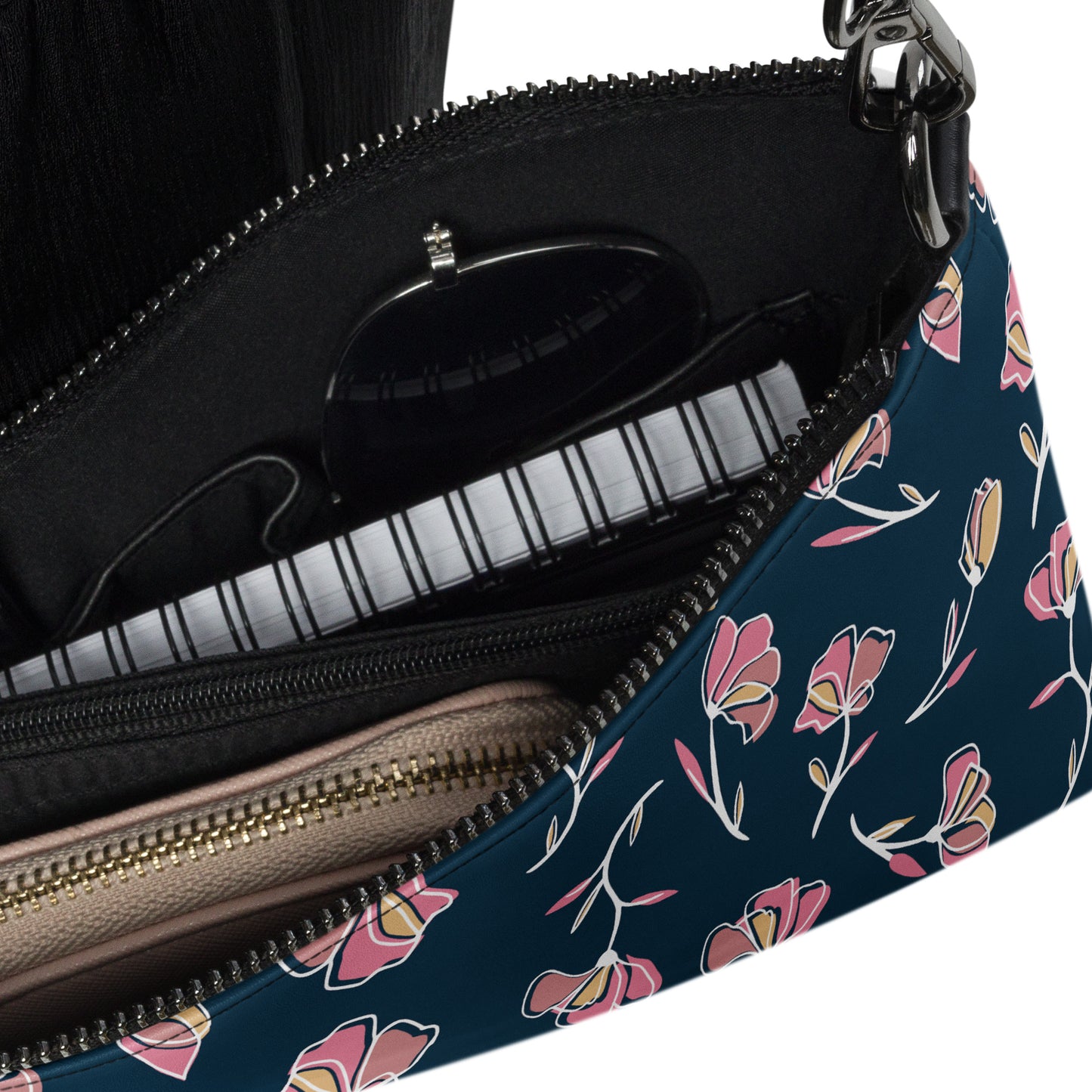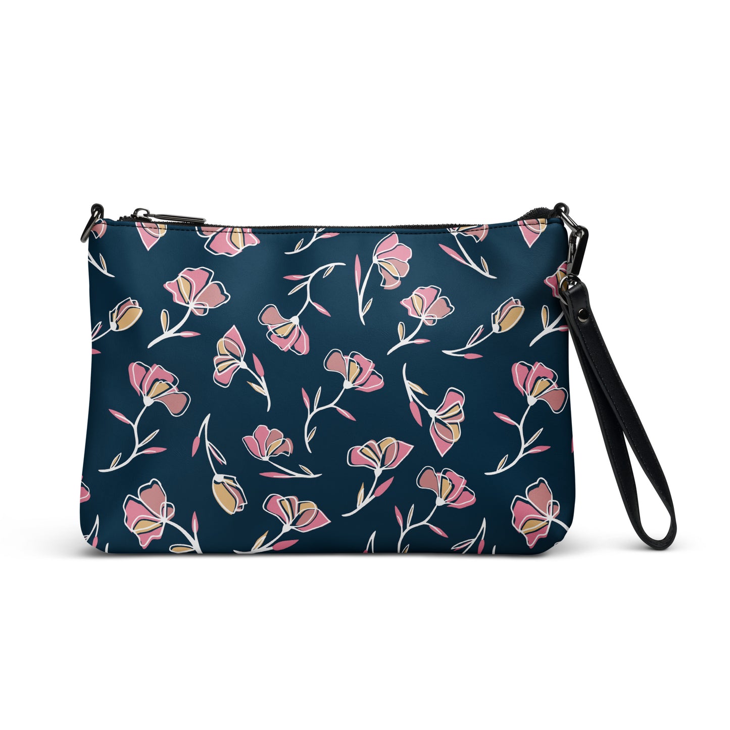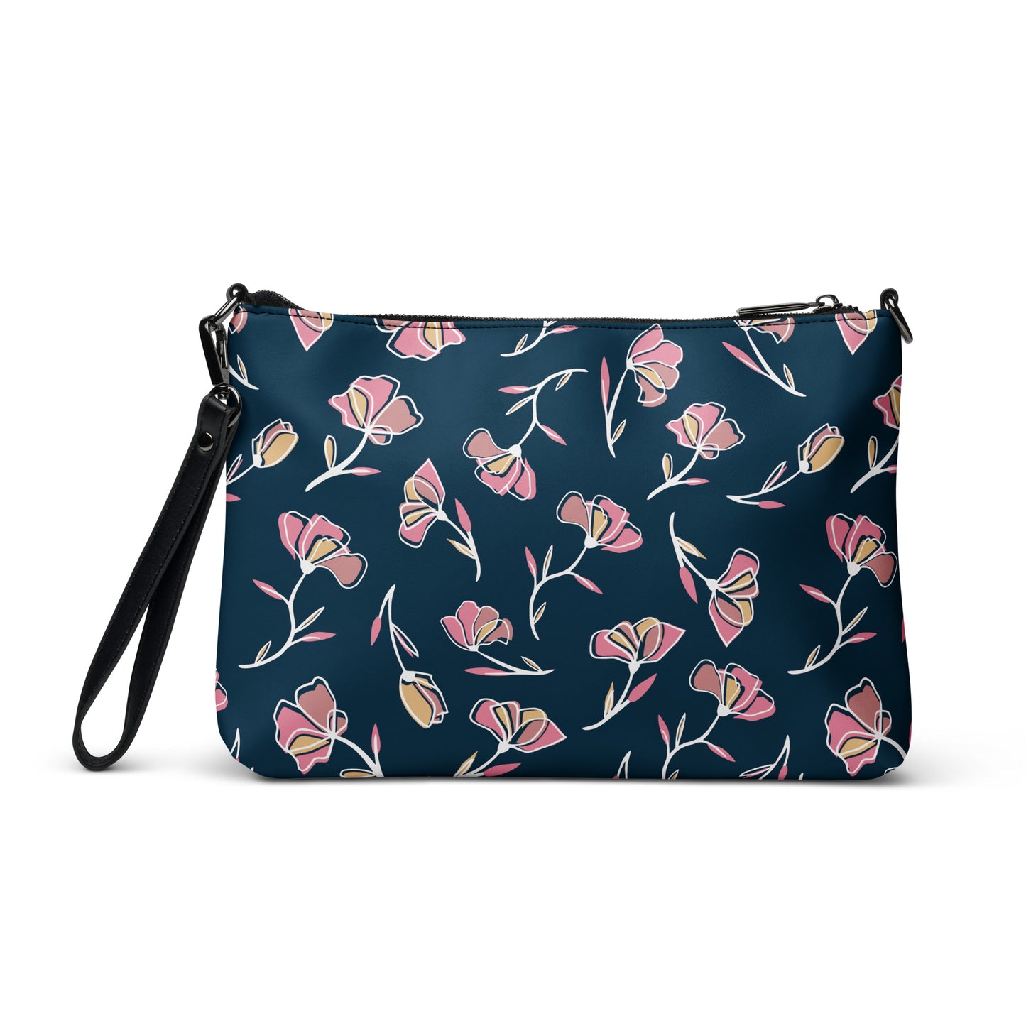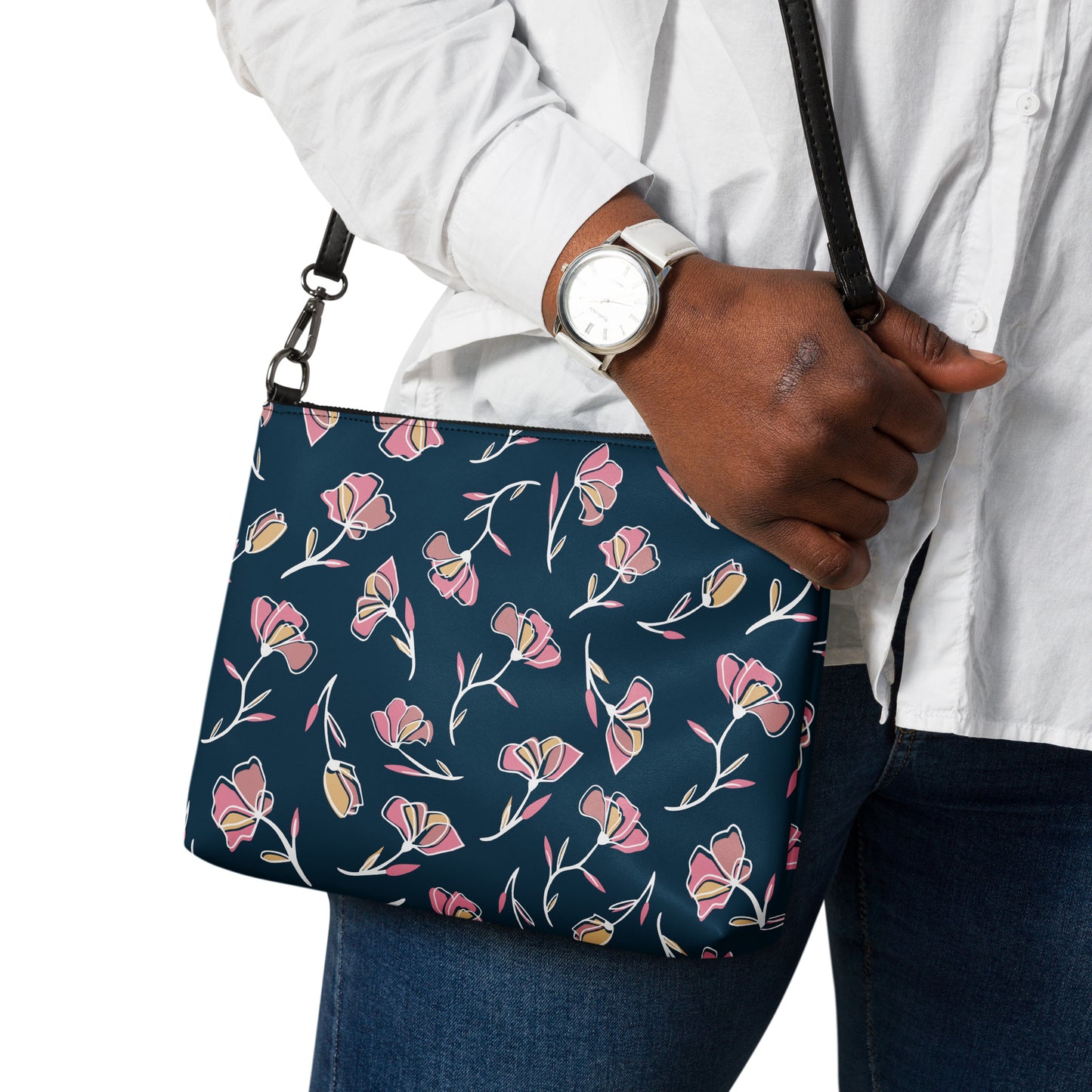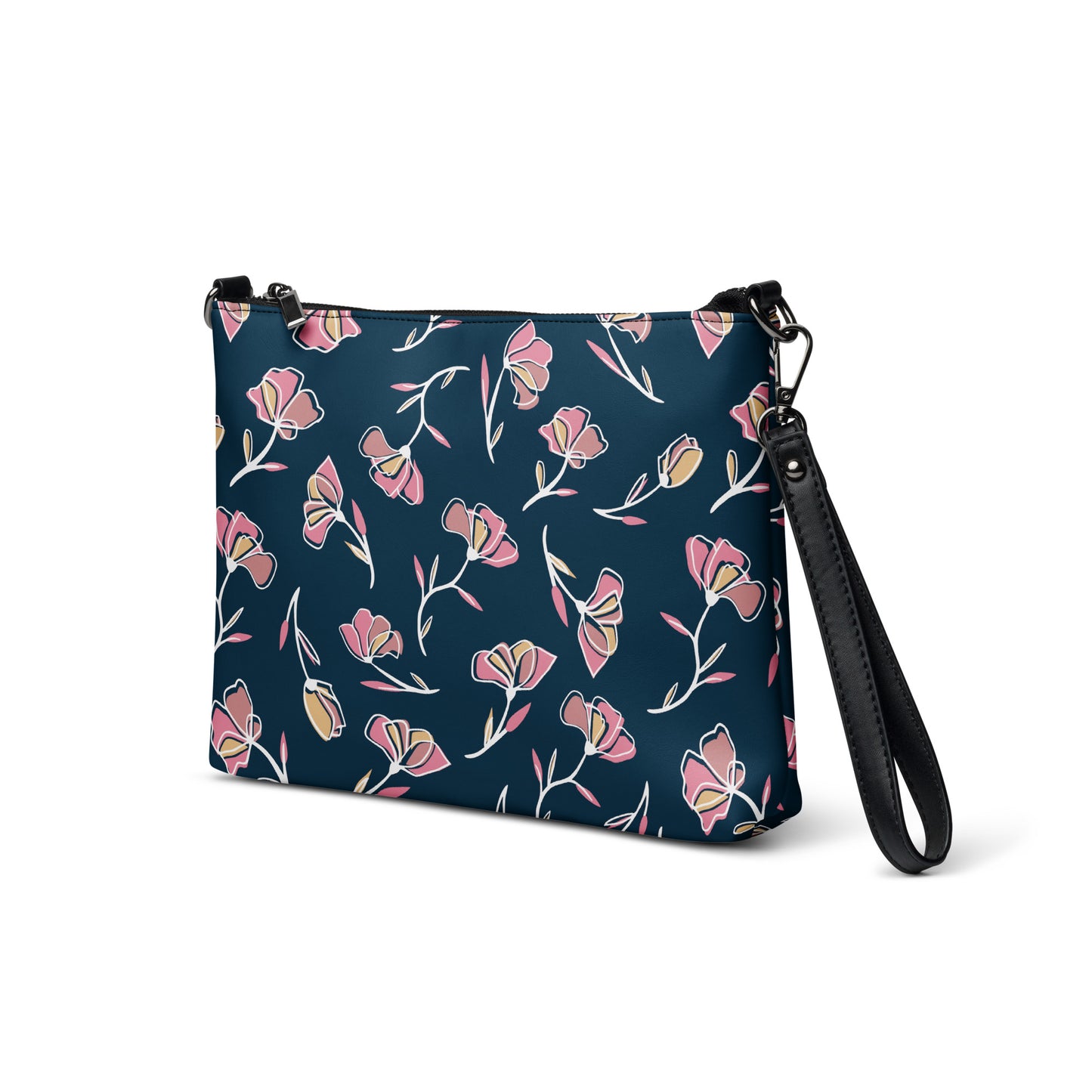 Keep your style on point and your hands free with our versatile Blue and Pink Mod Flowers Purse Handbag. It’s made of premium vegan faux leather and features dark gray hardware. Thanks to the zip-top closure and multiple inside pockets, you can keep your essentials secure and organized. Transform this crossbody bag with interchangeable wrist and shoulder straps to style it for day-to-night looks.