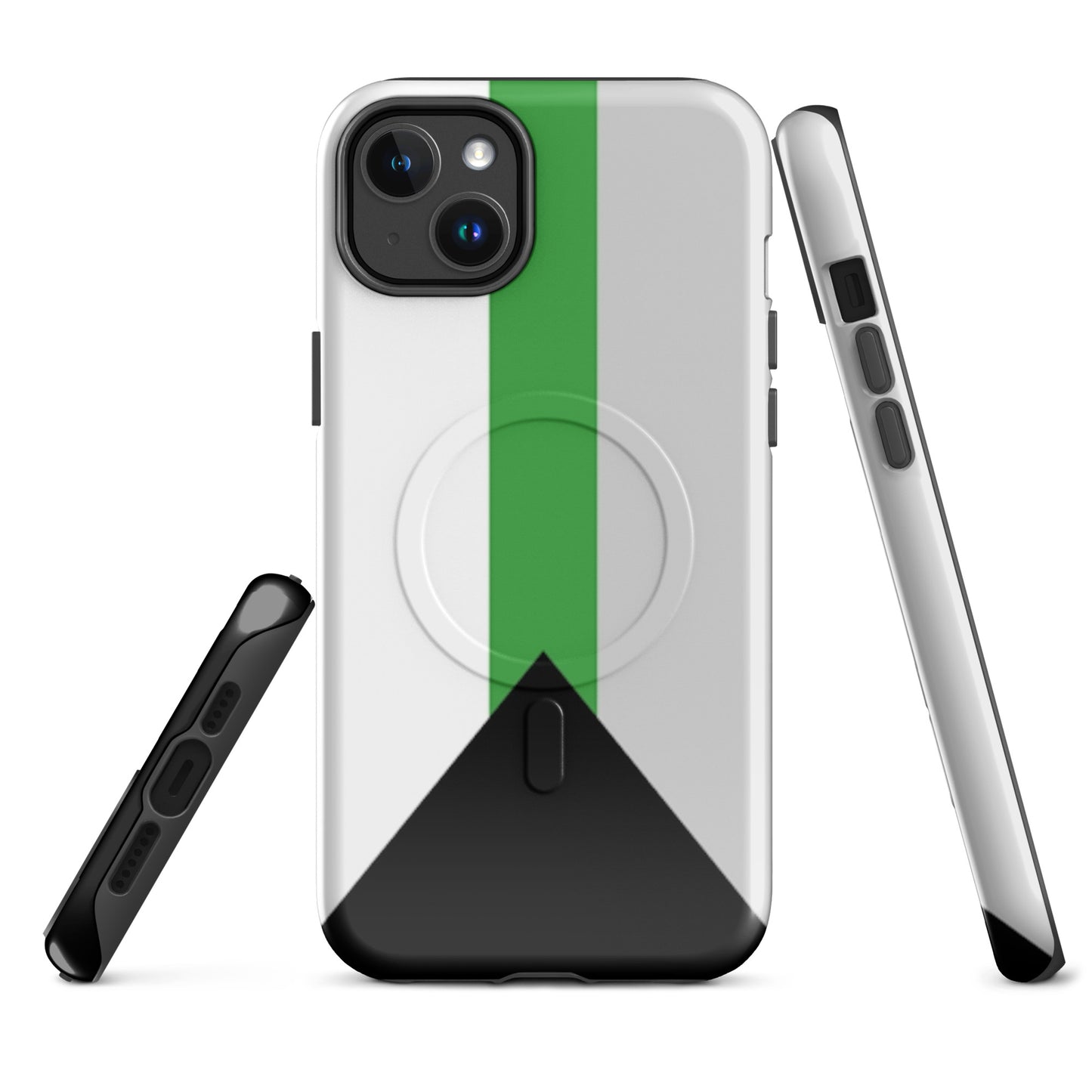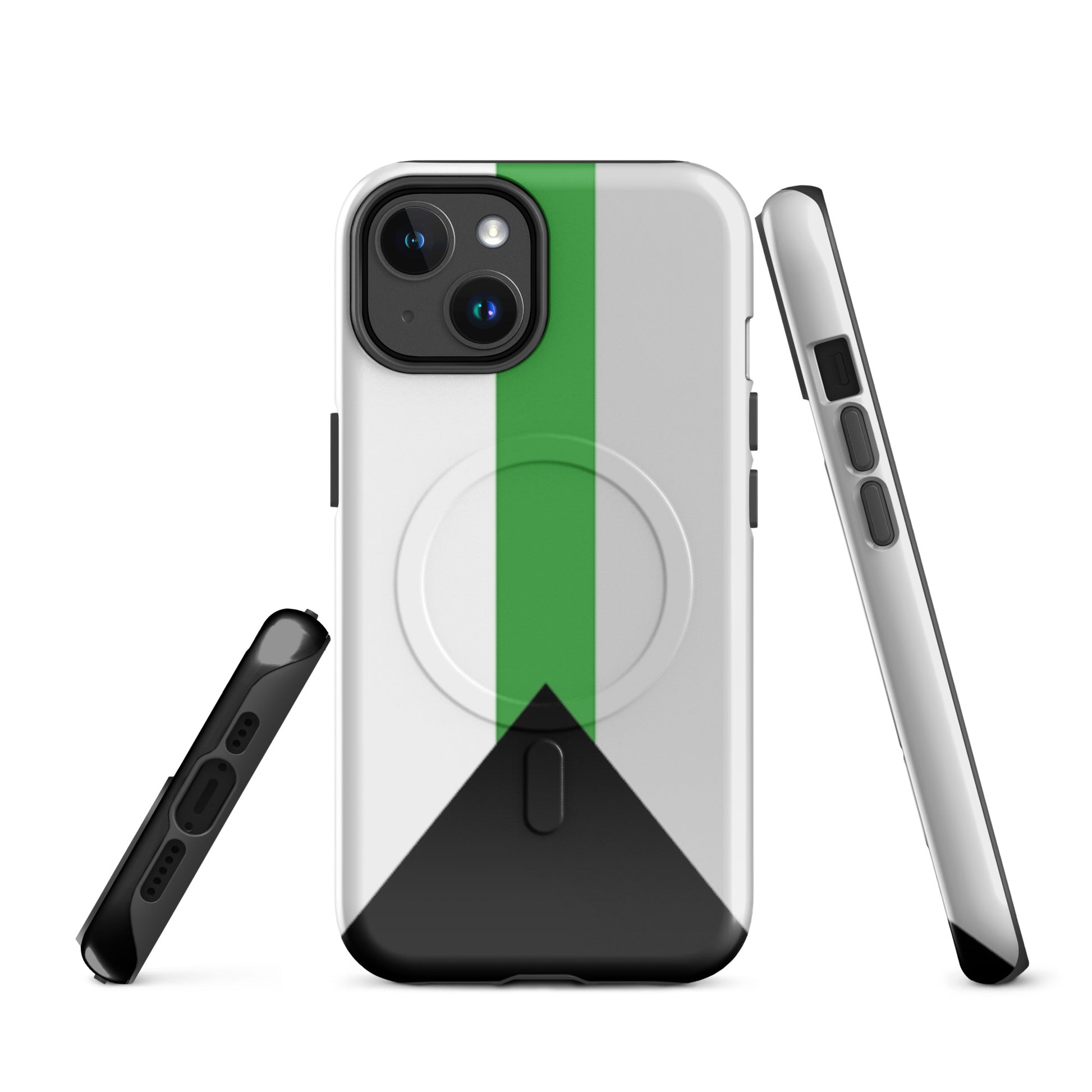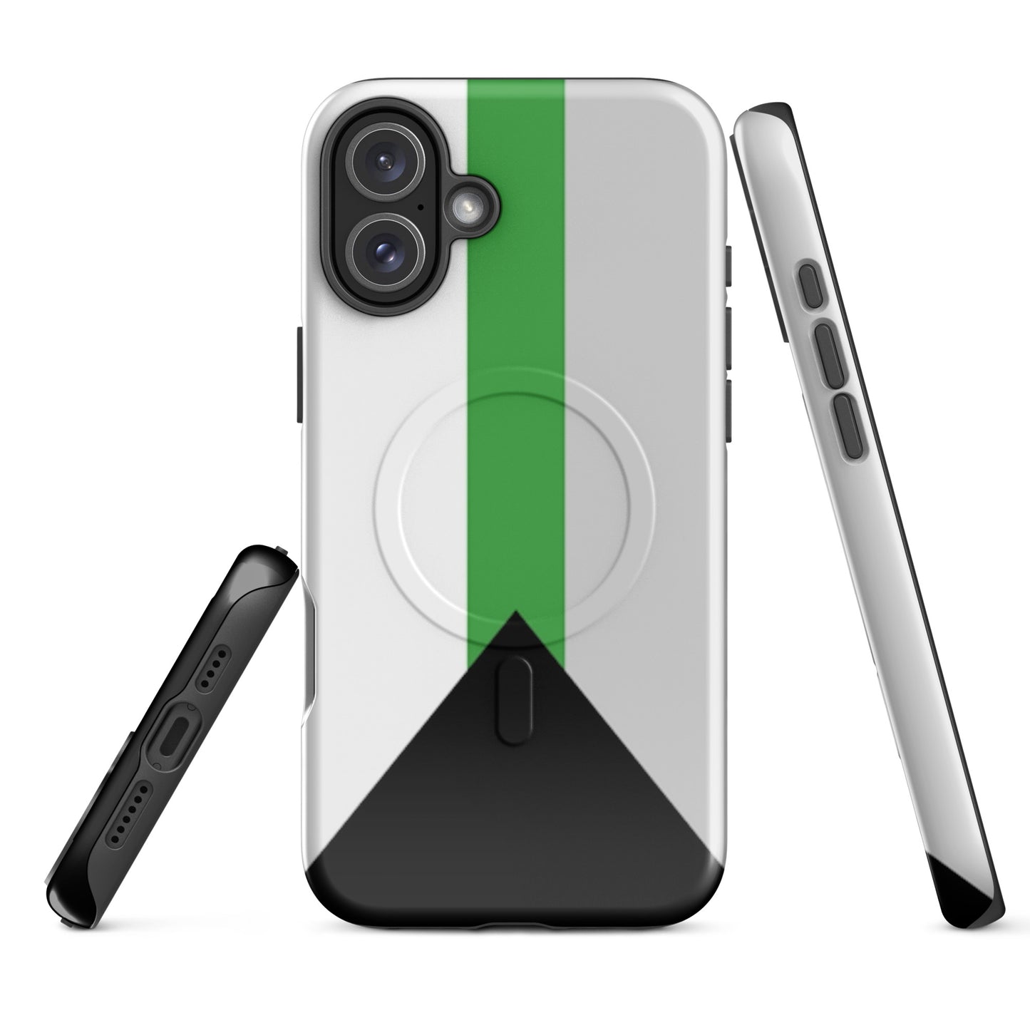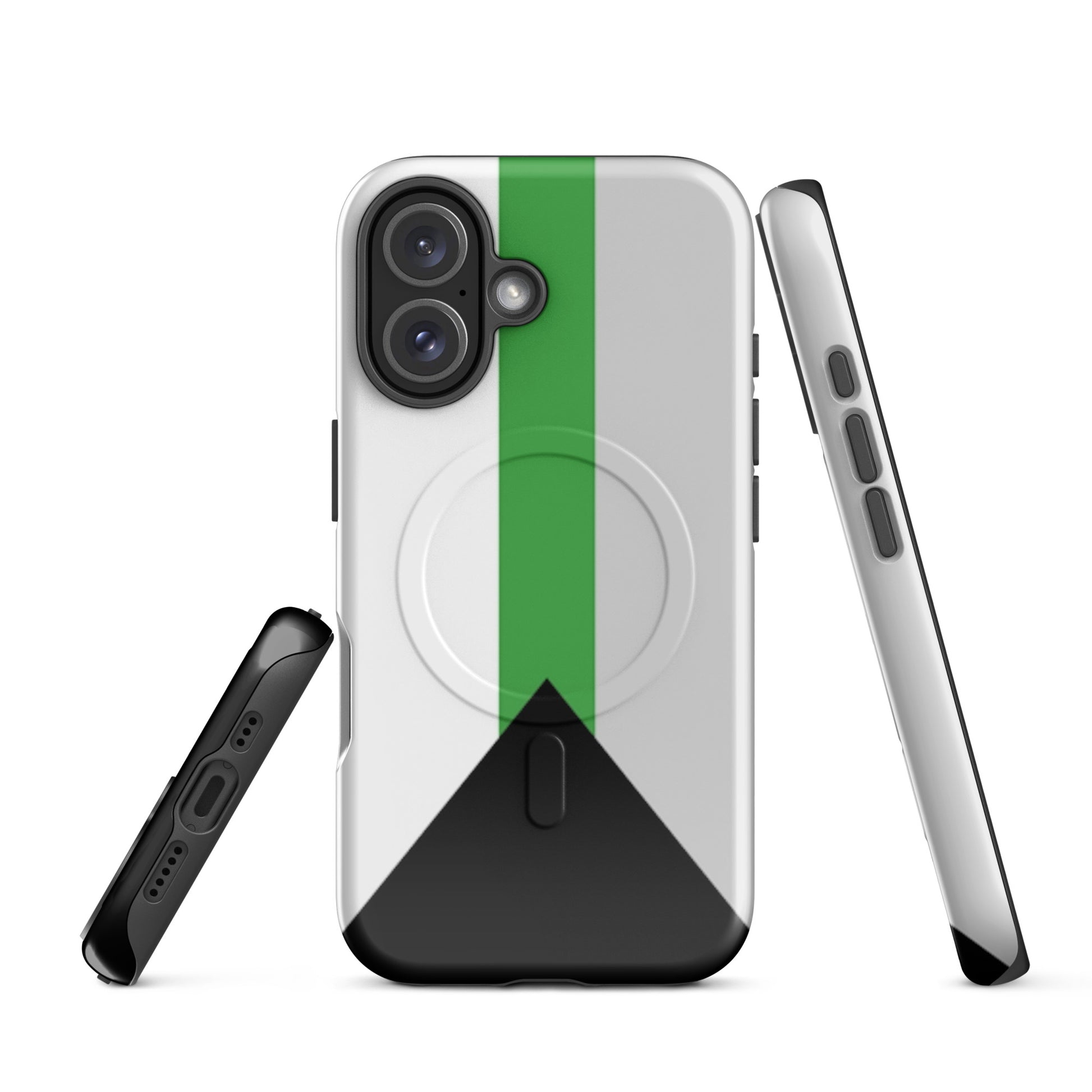 Celebrate your truth and protect your tech with the Demiromantic Pride MagSafe® Tough Phone Case for Apple iPhone®. Featuring the distinctive demiromantic pride flag—black, gray, white, and green—this bold, high-quality phone case is a powerful way to show your romantic identity with confidence and clarity.