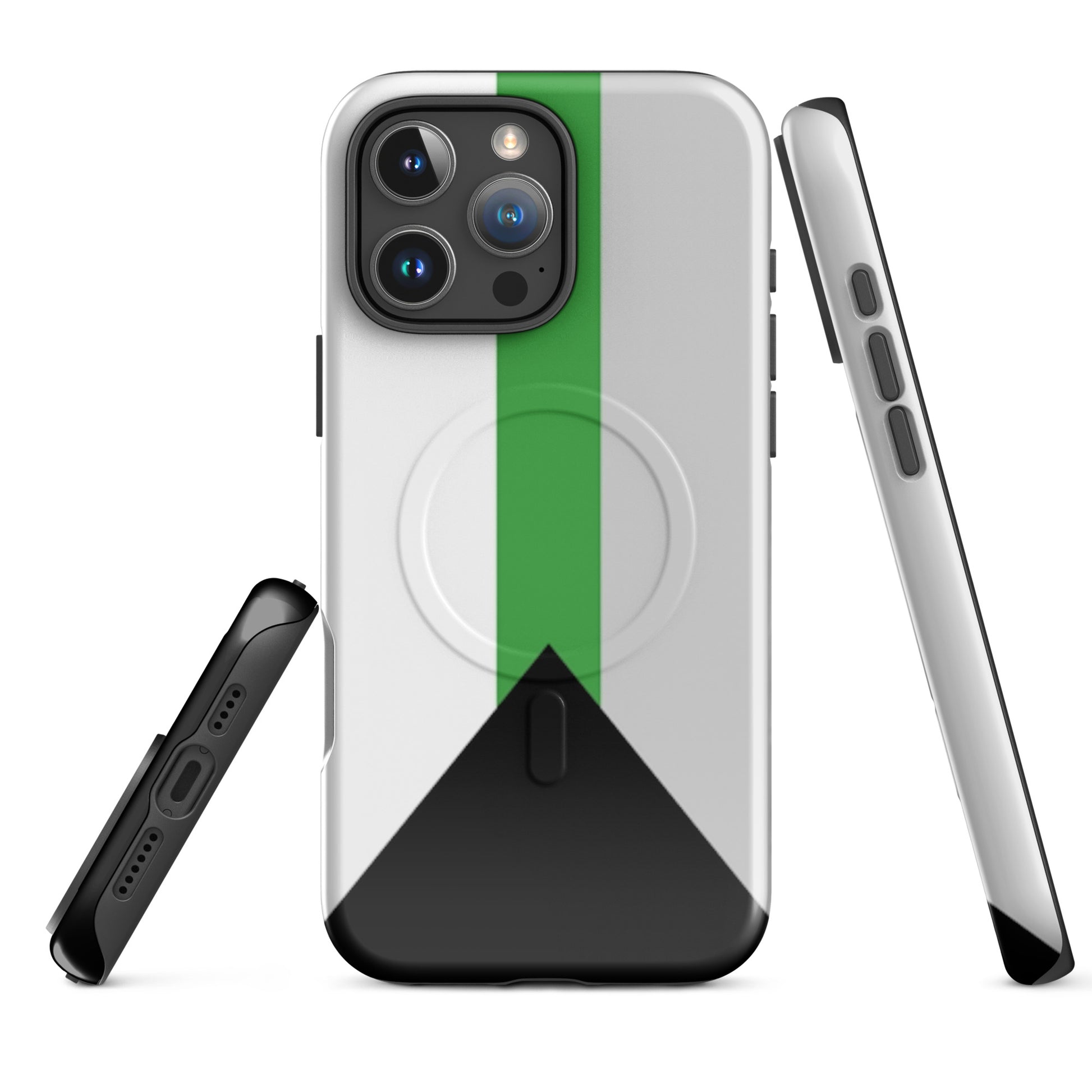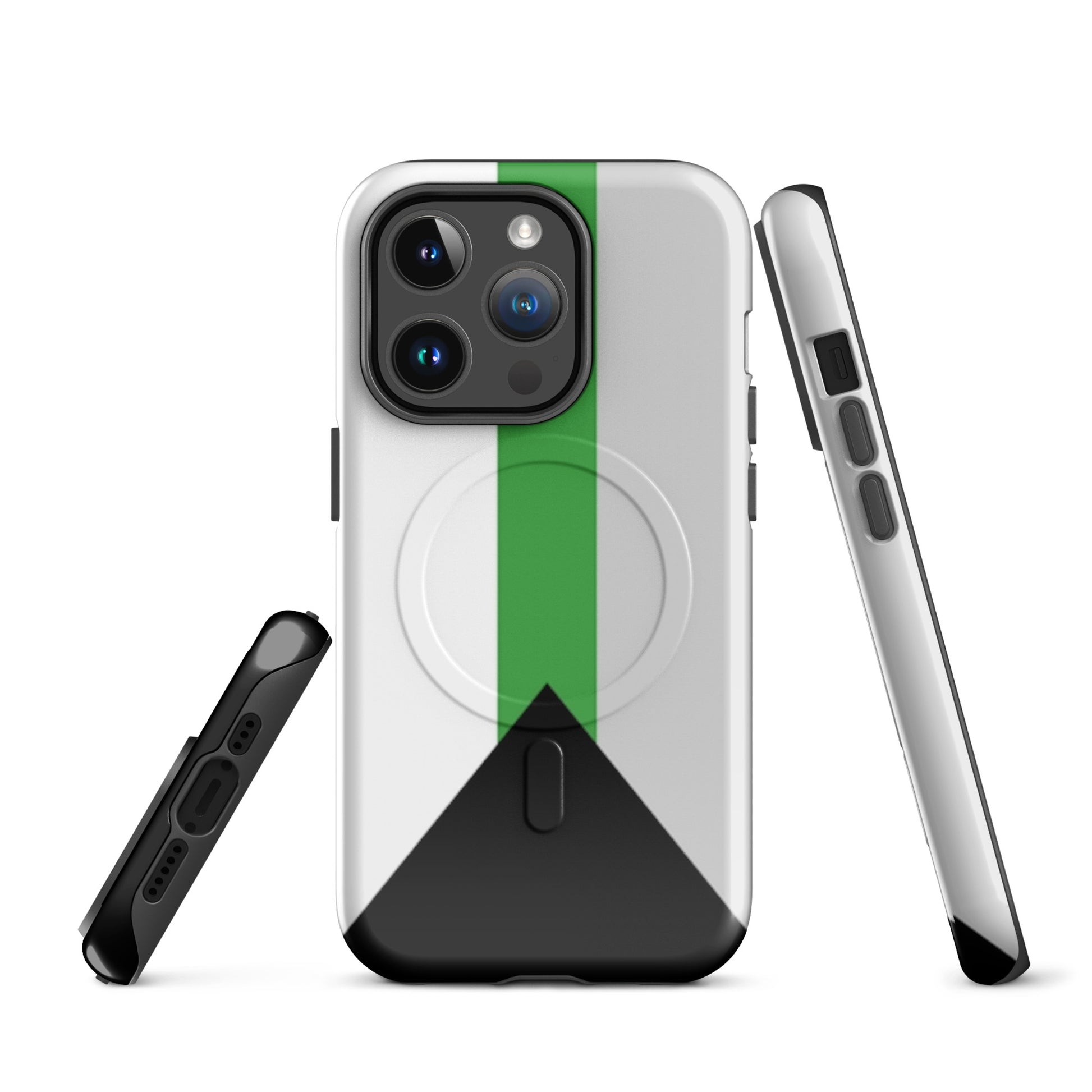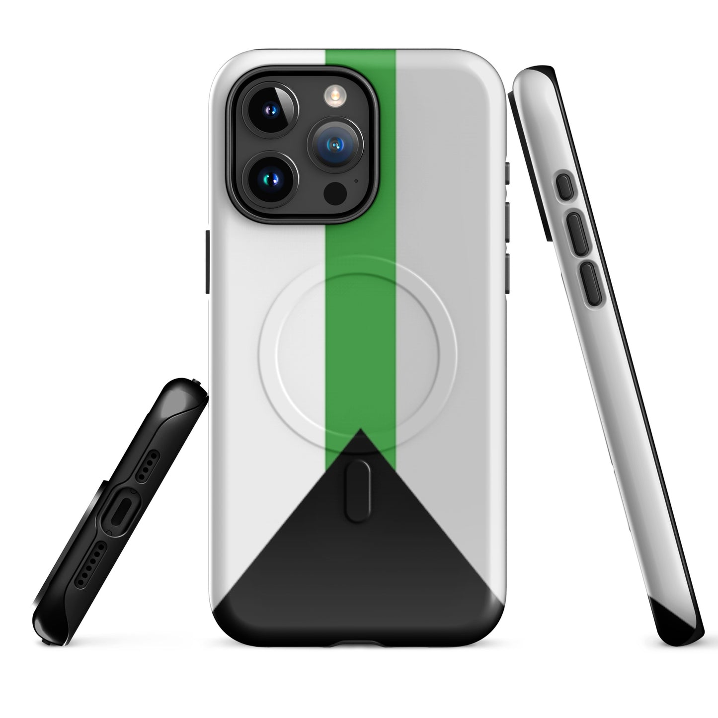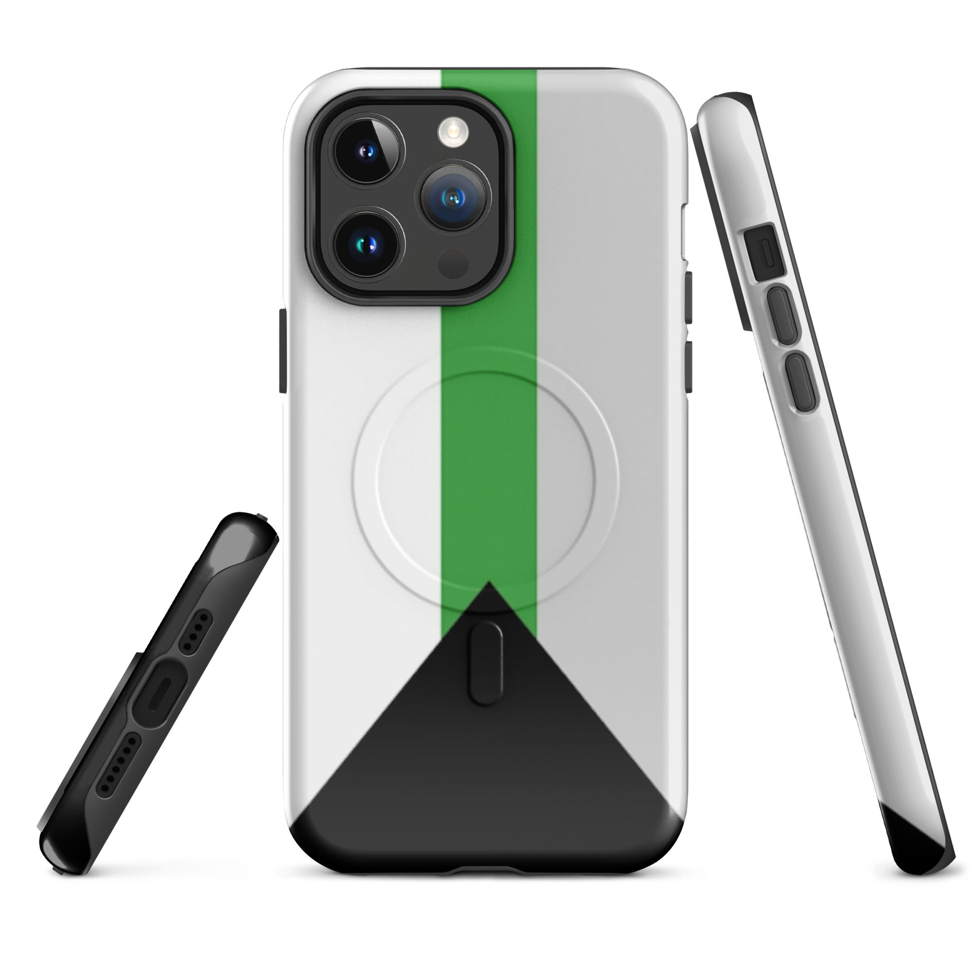 Celebrate your truth and protect your tech with the Demiromantic Pride MagSafe® Tough Phone Case for Apple iPhone®. Featuring the distinctive demiromantic pride flag—black, gray, white, and green—this bold, high-quality phone case is a powerful way to show your romantic identity with confidence and clarity.
