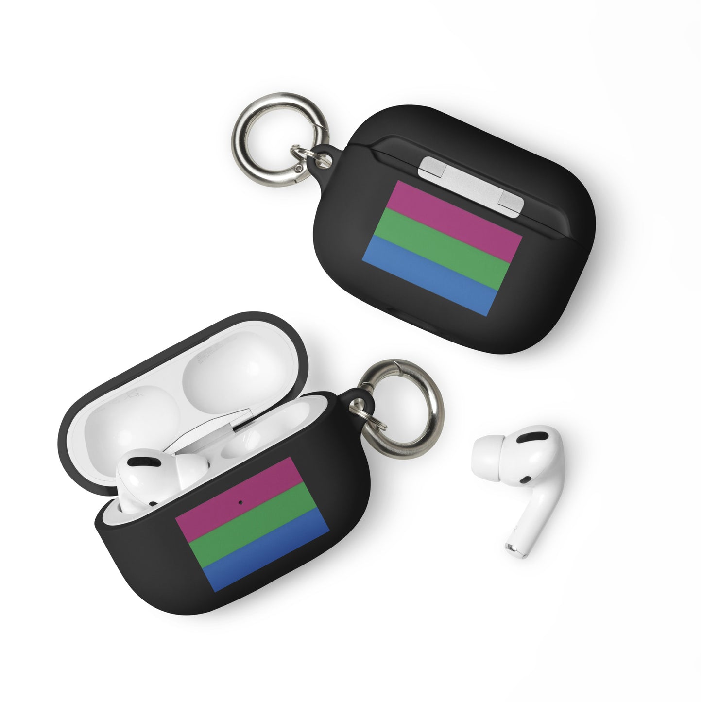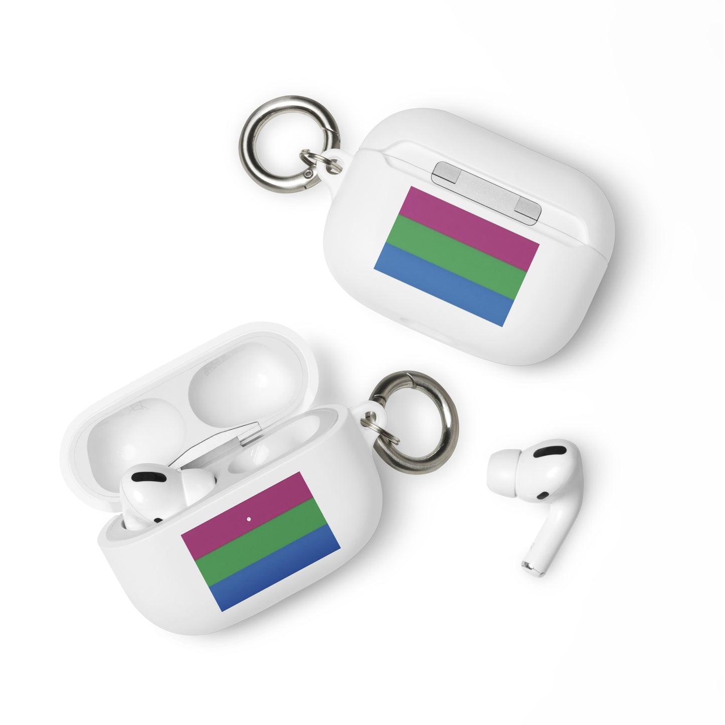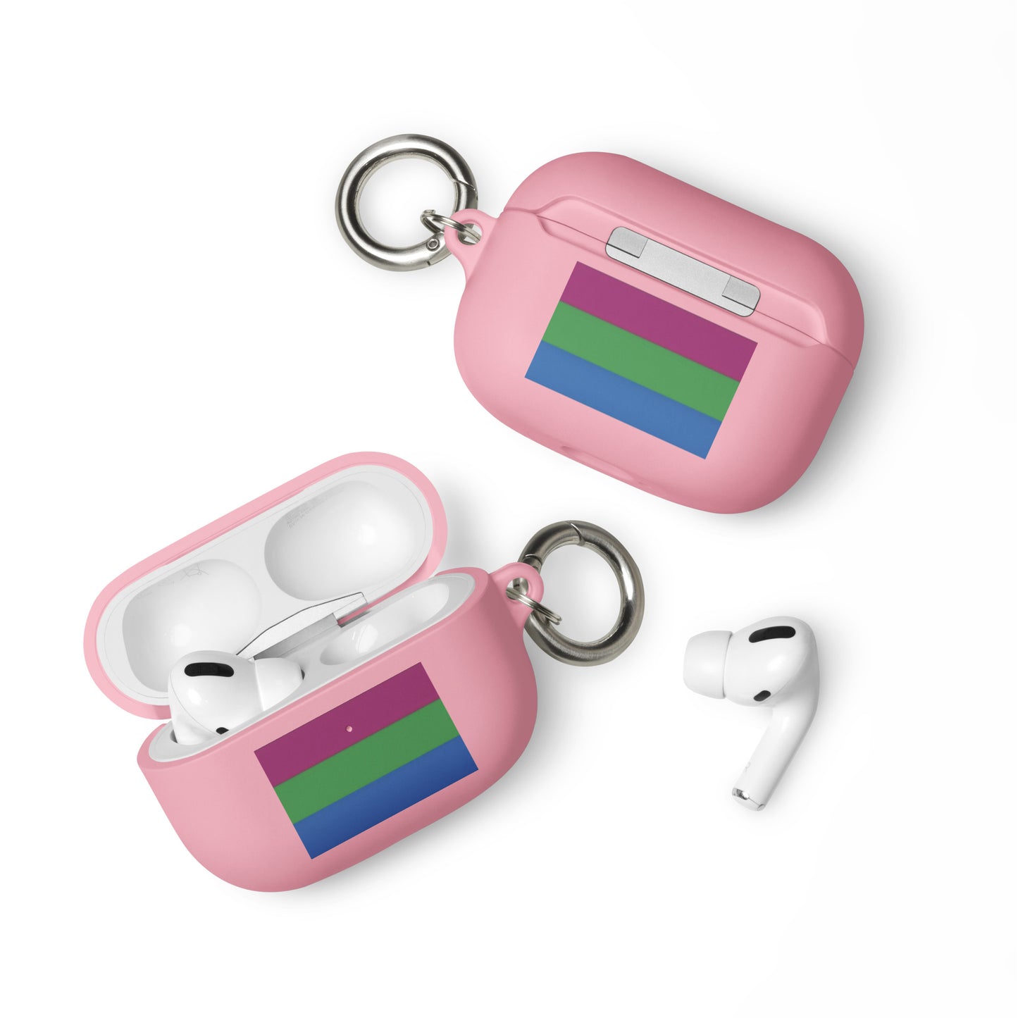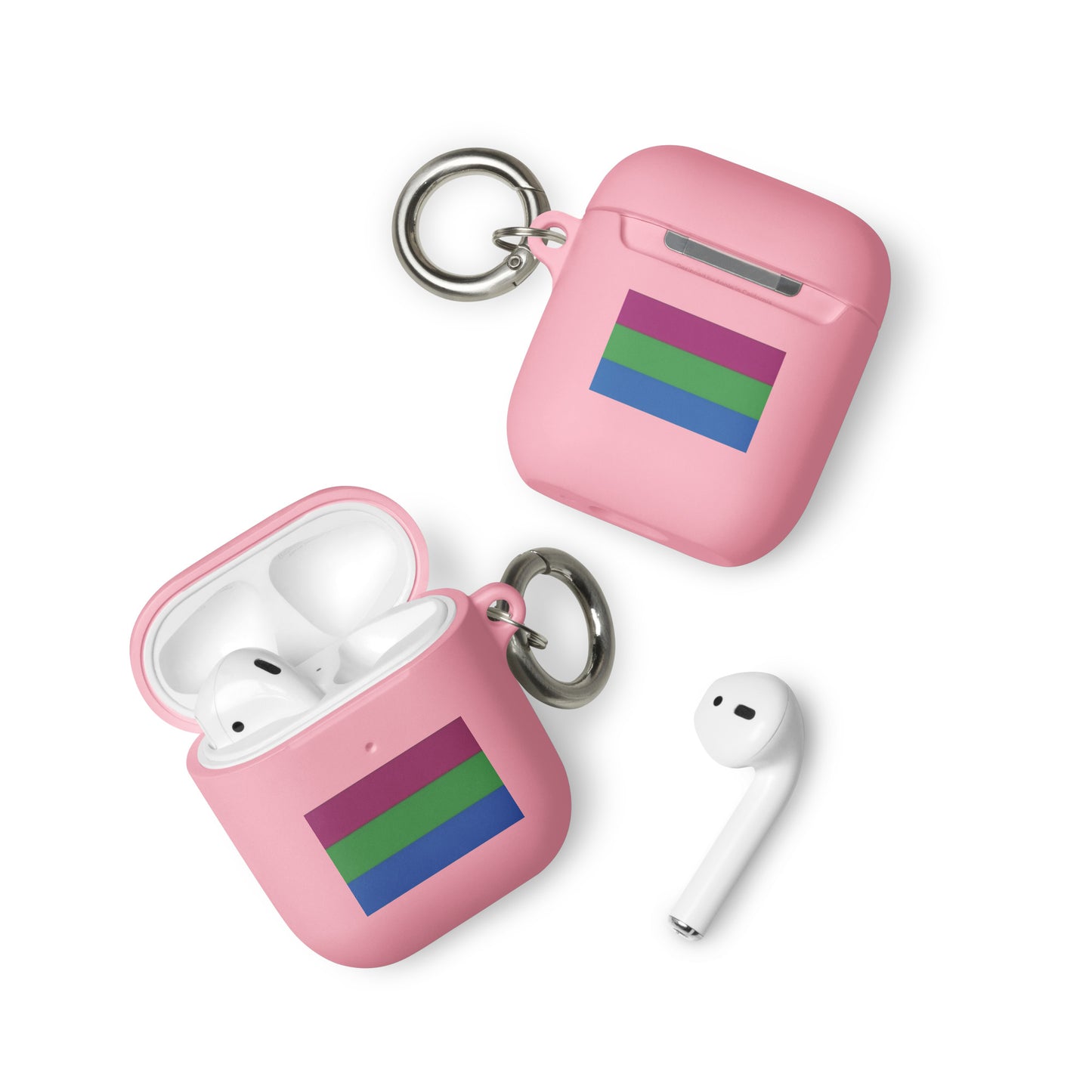 Get a two-in-one deal with these Polysexual Poly Pride Flag Rubber Case for Apple AirPods®: an impact-absorbing protector for your earbuds and a stylish accessory you can attach to your clothes and bags with a metal carabiner. This case is made from a durable TPU material and works with both wireless and regular AirPod® chargers.